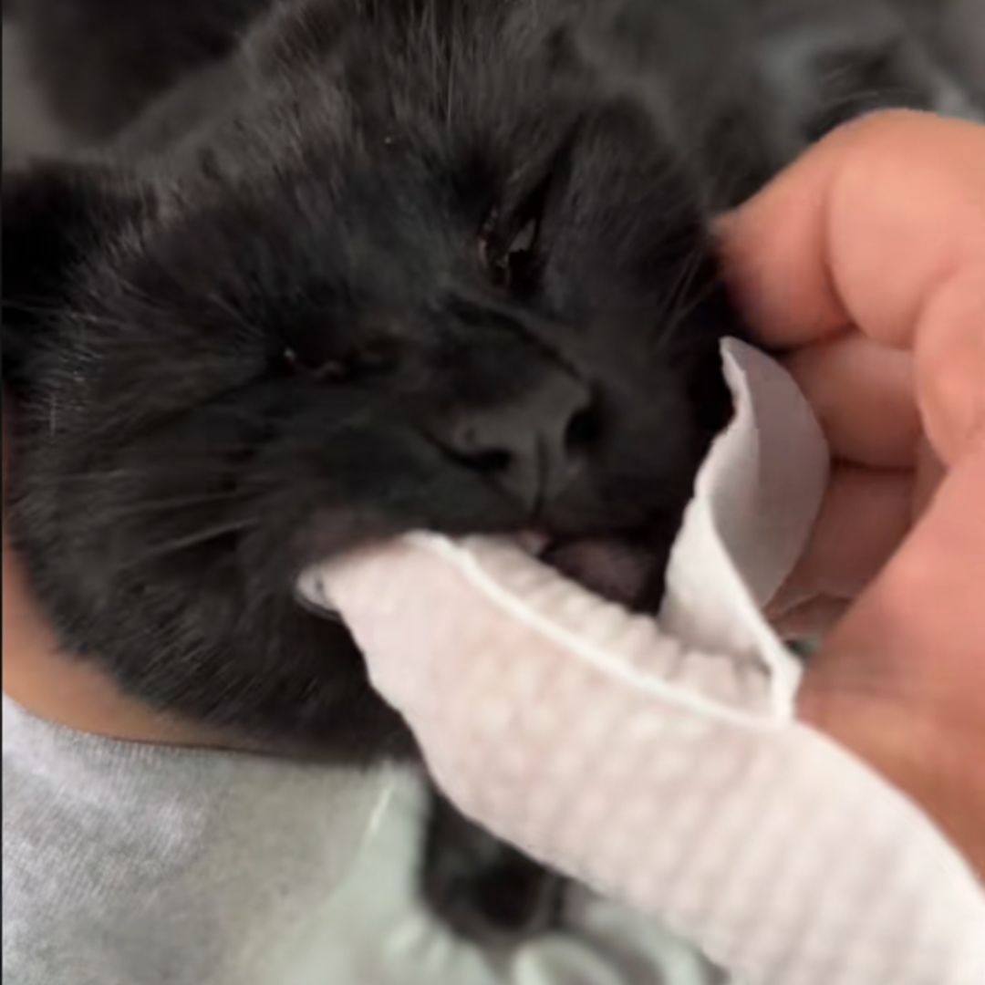 Slip the wipe onto your finger and gently clean your cat’s teeth and gums.