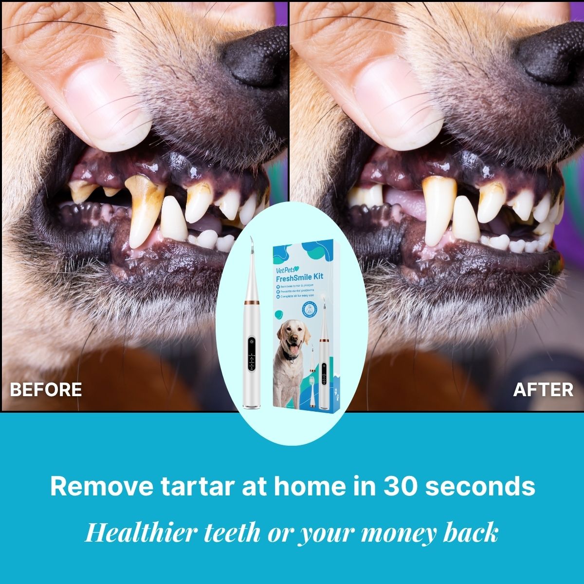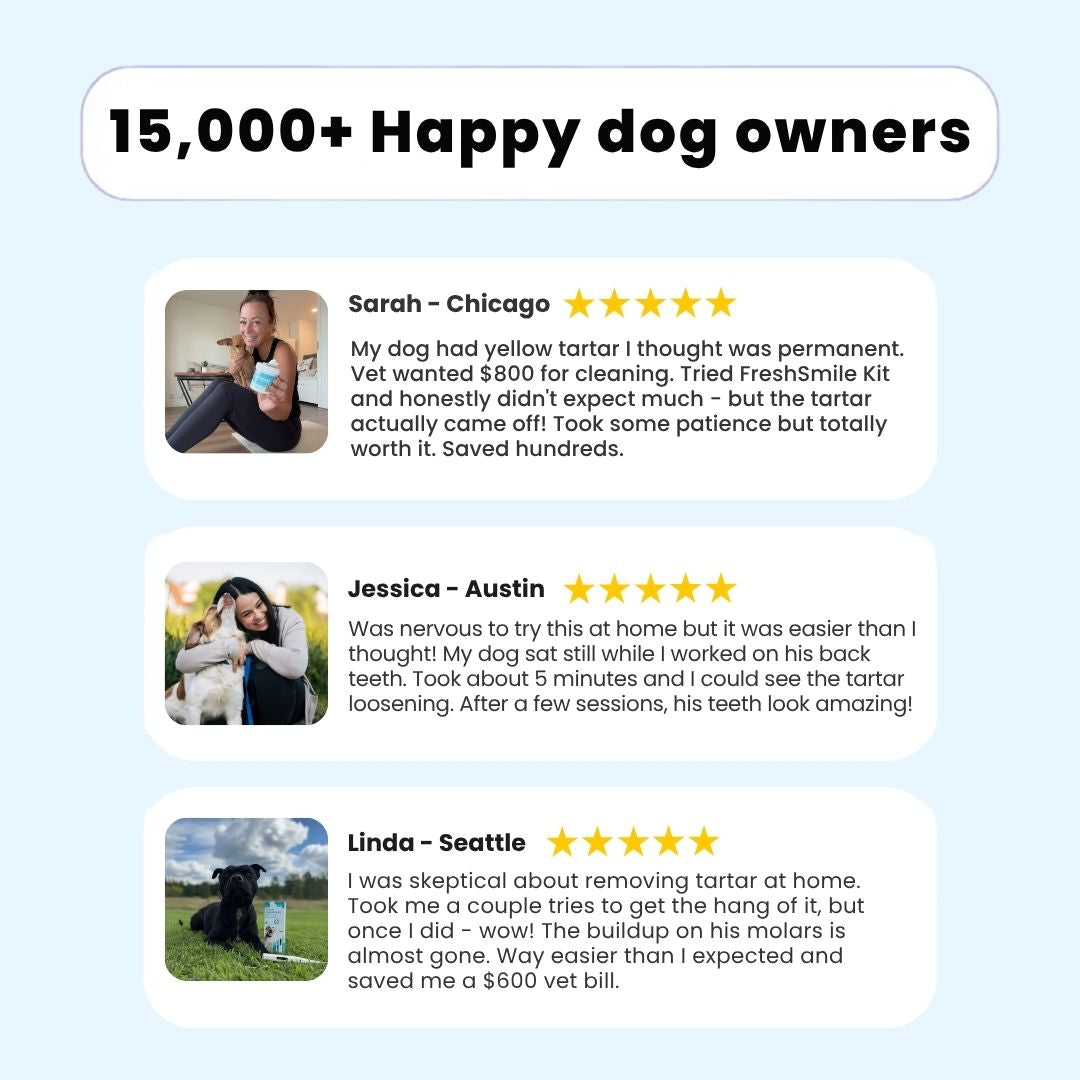 Vets often use anesthesia and special instruments. FreshSmile Kit is not a replacement for veterinary care, but it is an effective way to remove plaque and tartar at home – which helps reduce the need for expensive cleanings.