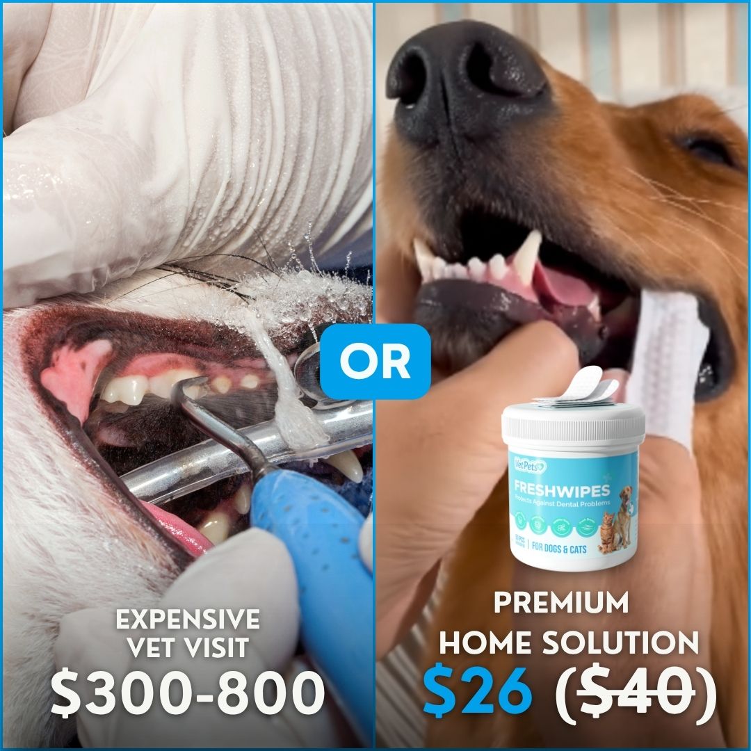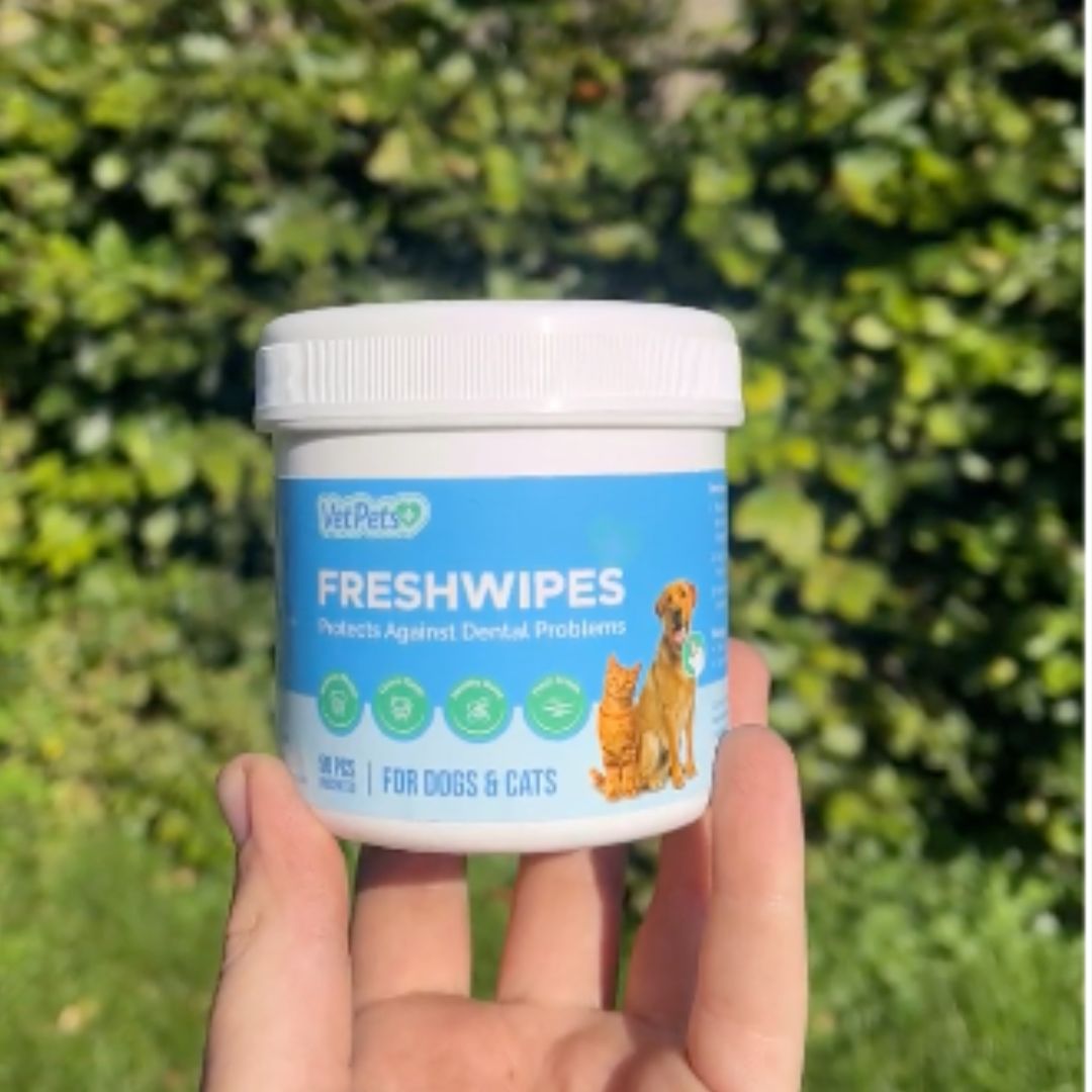 FreshWipes de VetPets te ofrecen una forma fácil y cómoda de cuidar la salud bucal de tu perro — sin visitas al veterinario, sin estrés y sin incertidumbre.