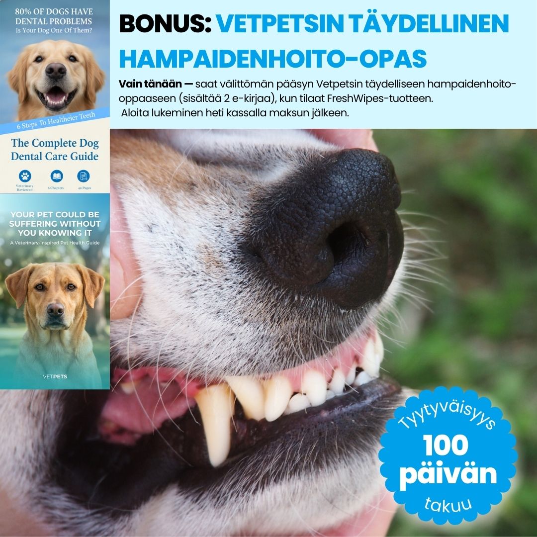 FreshWipes puhdistaa hellävaraisesti koirasi hampaat ja ikenet.